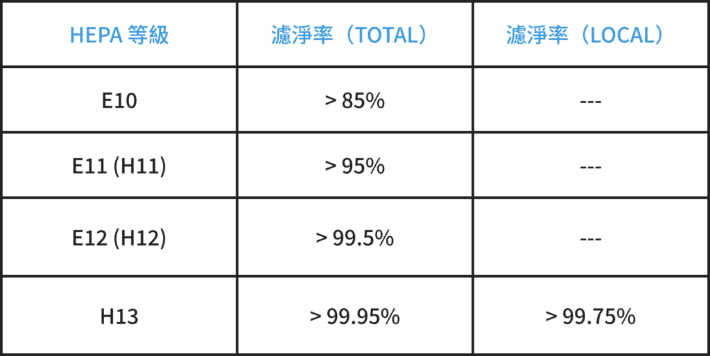 歐盟國家中,該技術規範通常也以歐洲標準化委員會以 EN 1822:2009.呈現。其根據最以穿透粒徑的過濾效果(MPPS),定義了HEPA濾網的幾類等級: