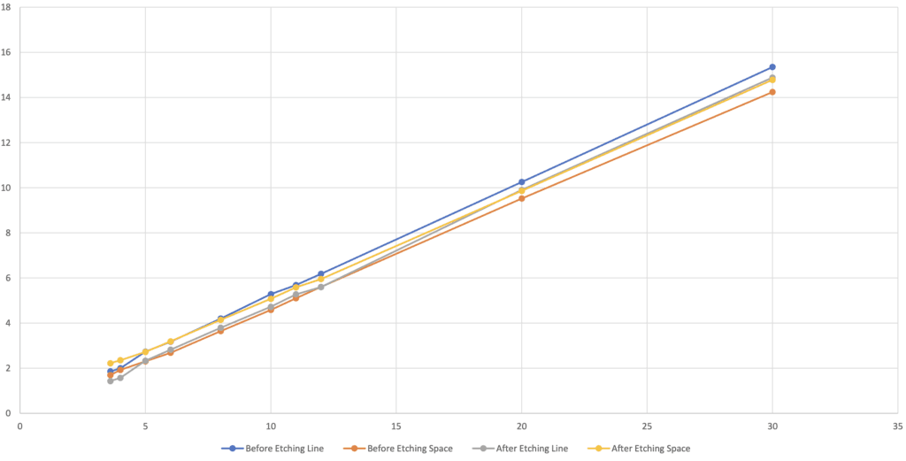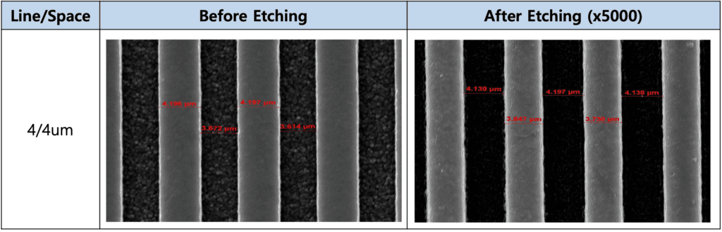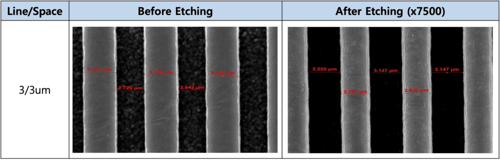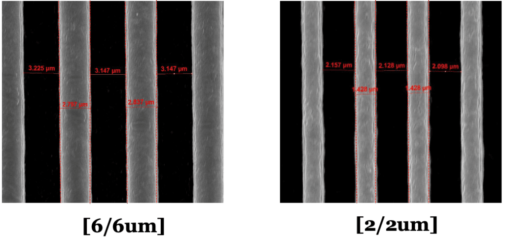 - 蝕刻確認可達8/1.8um。通過確保電路直線度,最大限度地減少因非蝕刻而導致電路缺陷的可能性