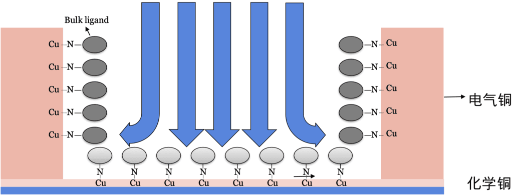 - 在底部的種子層中,抑制劑的結合被噴霧的垂直力破壞,並且蝕刻進行